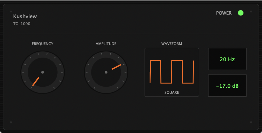- Waveform: Click the panel to instantly cycle through four classic waveforms: Sine, Square, Saw, and Triangle. The label and mini-display update immediately to show your selection. For the cleanest high-end tone and for high-frequency checks, we recommend using the Sine wave.